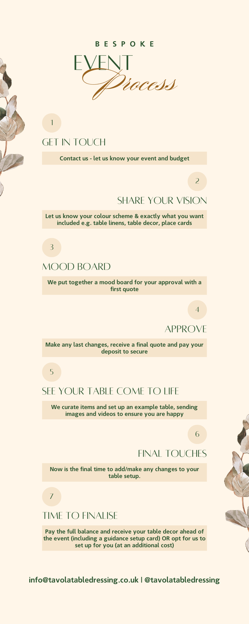 If you're planning a private event such as a wedding or birthday celebration, Tavola offers the option to create bespoke tableware tailored to your event. All packages are priced via a personalised quote, and we're confident we can meet a wide range of styling needs.